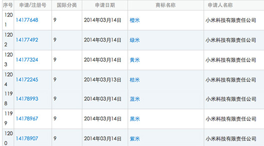 小米科技有限责任公司注册了“大米”、“蓝米”、“黑米”、“紫米”、“橙米”、“绿米”、“黄米”、“桔米”等商标。